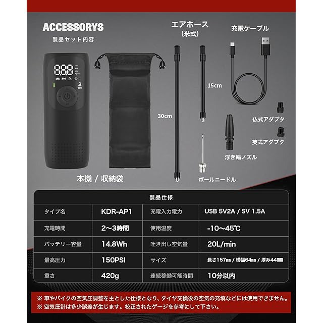 【商品仕様】 ■電池容量:デュアルバッテリー2000mAh/3.7V合計4000mAh/14.8wha ■吐出量:150PSI(20L/min) ■充電:5V2A/タイプC ■空気圧単位:PSI、BAR、KPA、Kg/cm2 ■空気圧上限:999KPA