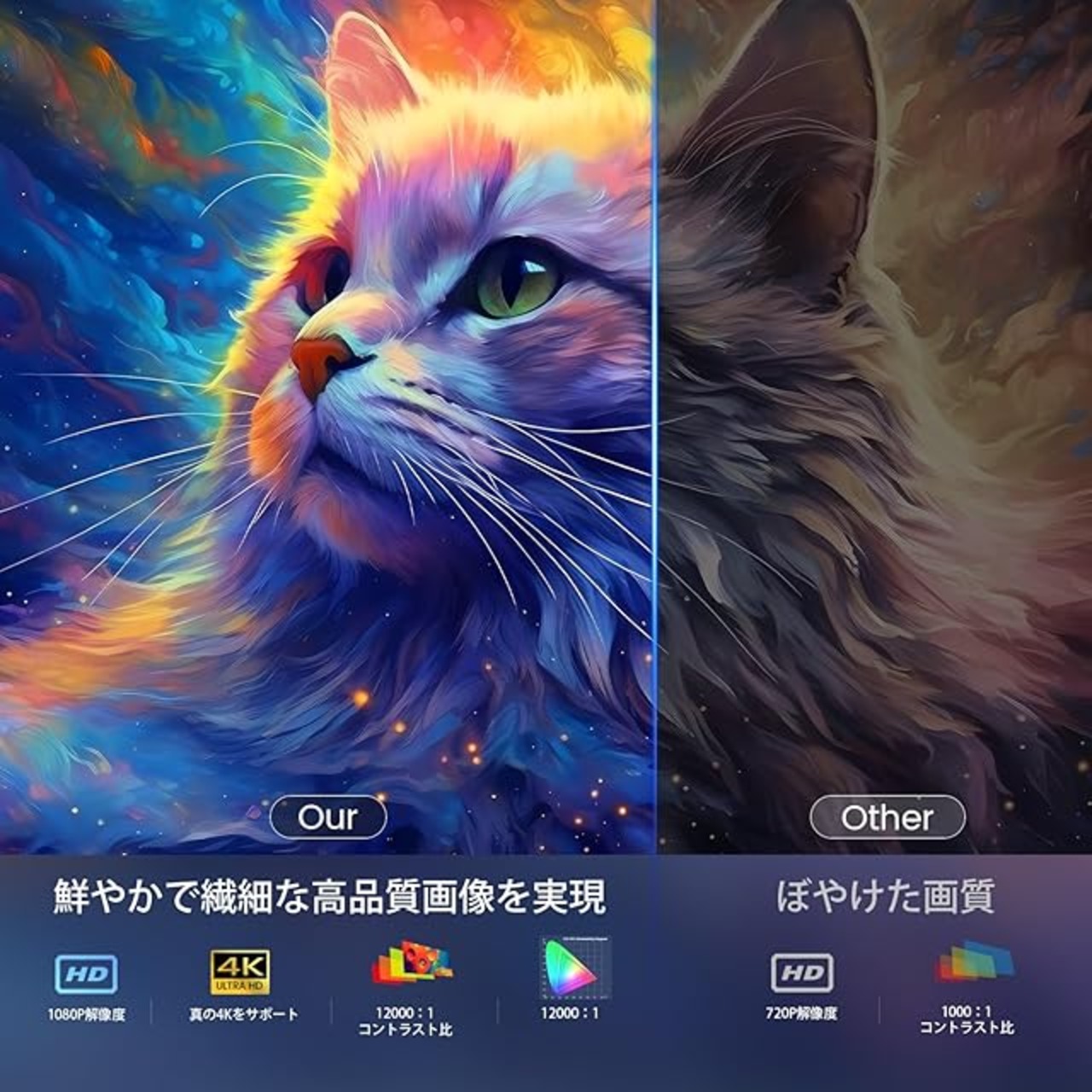 ✅【18000LM&1080P&4K対応】家庭用プロジェクターは18000ルーメンの明るさと1080Pの高解像度を持ち、最大4Kをサポートします。12000:1の優れたコントラスト比と99%以上のNTSC色域を備えており、画質が繊細で、効果が自然であります。画像と動画本来の鮮明さと色を最大限に再現します。より現実感のあるリアルな映像を映し出します。白い壁に直接に投影しても、自然な色再現の美しい映像をお楽しみ、スクリーンがなくても大丈夫です。また、拡散反射の原理でテレビの直射光より小型プロジェクターの拡散光源がもっと柔らかくて、視覚的に楽しみながら目をしっかり守ることができます。