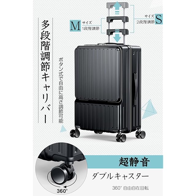 [Atzone Ginza] スーツケース フロントオープン キャリーケース 超軽量 USBポート付き カップホルダー付き 隠しフック機能 キャリーバッグ ABS+PC 耐衝撃 静音 ダブルキャスター TSAローク ファスナータイプ キャリーバッグ 人気 おしゃれ 旅行 ビジネス 出張 入院 (ブラック, Sサイズ/機内持込(42L容量))