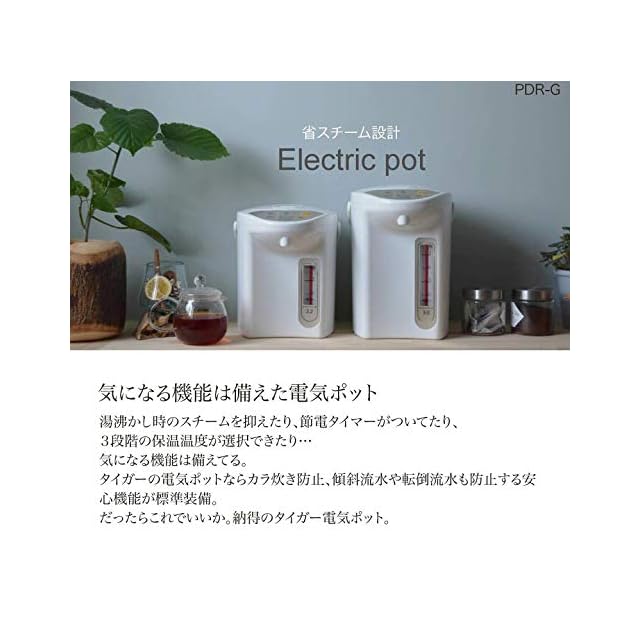 特長:1.節電タイマーで電気代お得 2.98℃・90℃・70℃の3段階で保温温度が選べる 3.蒸気量約1/3カットの省スチーム沸とう