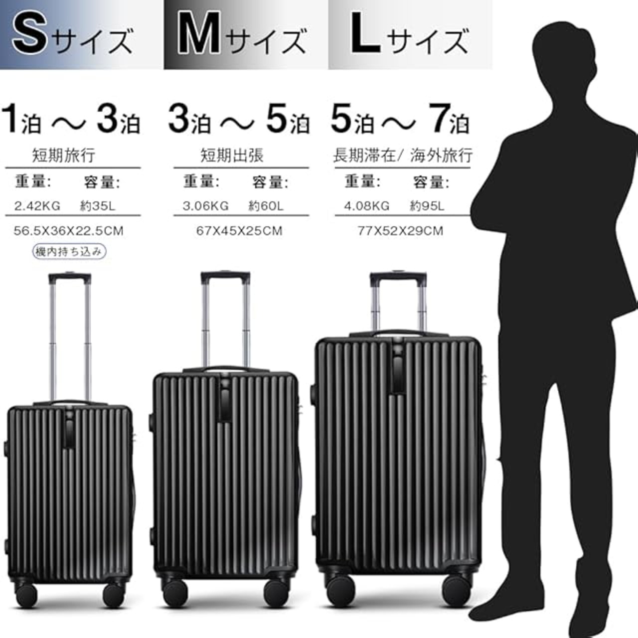 [BARGOHOY] スーツケース 大容量 キャリーケース 超軽量 キャリーバッグ 隠しフック機能 静音 360度回転 ダブルキャスター ファスナー式 TSAロック搭載 PC材質 耐衝撃 旅行 ビジネス 出張 (ブラック, Mサイズ/60L(4~7泊))