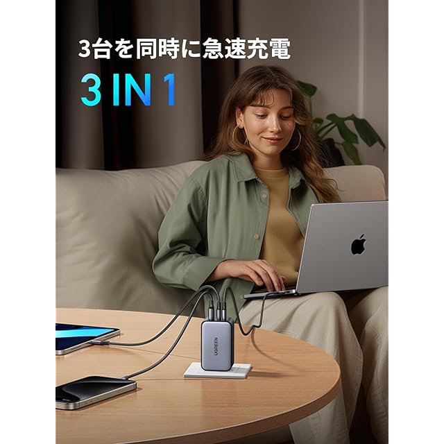 【3台のデバイスを同時に充電】 2つのUSB-Cポートと1つのUSB-Aポートを搭載し、最大3台のデバイスを同時に充電できます。合計で最大100Wの給電が可能なため、スマートフォンやスマートウォッチはもちろん、タブレット、ノートパソコンなどの大容量力デバイスを急いで充電したいときに便利です。 .
