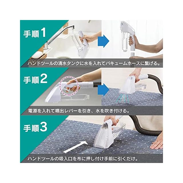 ソファーやカーペットなどの布製品を洗浄するときに便利。スプレーで水を吹きかけて汚れを浮かせ、浮かせた汚れを水と共に回収します。