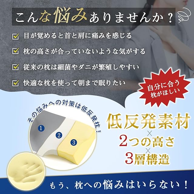 【60D高密度低反発枕】枕本体は高密度60D低反発ウレタンで作られ、高品質の詰め物は弾力性と安定性に優れています。体圧分散性が高く、負荷を均一に分散してくれるので寝心地も抜群です。従来の低反発枕に比べ、へたりにくく、温度による寝心地の変化が少ないです。