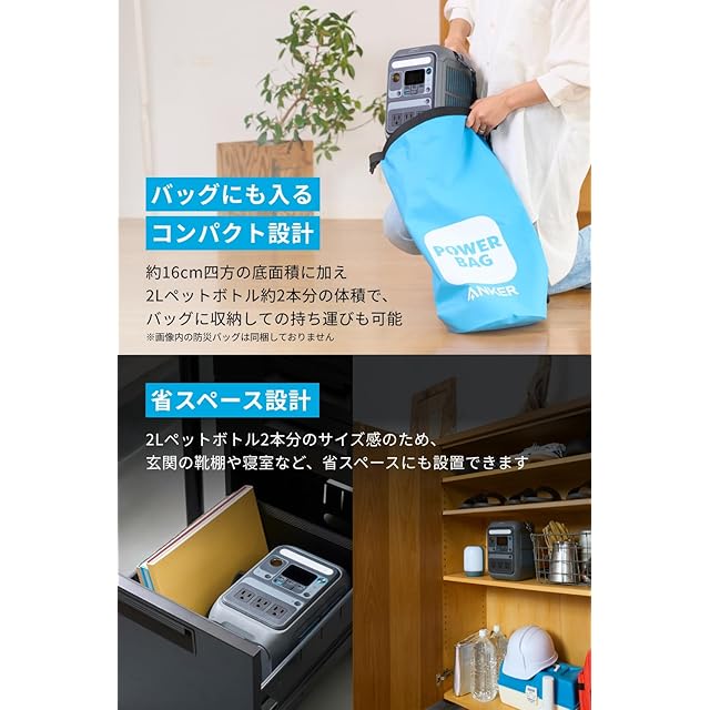 コンパクトかつパワフル:約16cmの四方の底面積に加え2Lペットボトル約2本分ほどのコンパクト設計を実現。バッグに収納しての持ち運びや、玄関のシューズボックスへの収納など、高い携帯性と収納性を備えています。ACポートからは最大300W、USB−Cポートからも最大140W出力が可能ノートPCへの急速充電はもちろん、テレビや電気毛布など停電時でも様々な機器へ給電 / 充電できます。