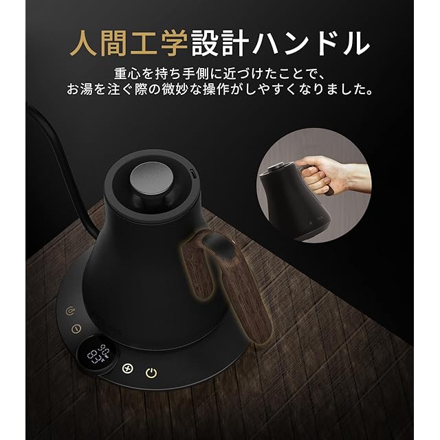 【人間工学設計ハンドル】人間工学に基づいたハンドル設計を採用しています。お湯を注ぐ際、手首や腕にかかる負荷を軽減し、繊細な操作を行うことができます。熱くならず、持ちやすいハンドルで、持つだけで自然と注ぐ角度になるように設計したことで、初心者でも操作しやすくケトルになりました。