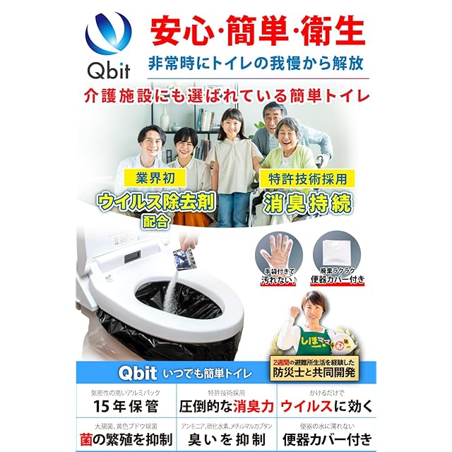 【業界初!ウイルスに効く除菌剤入り】Qbit簡単トイレは高い除菌効果があり、大腸菌などの菌類のみならず、携帯トイレ業界にはなかった、ウイルスに有効な除菌剤を入れています。災害用だけでなく、介護分野のお客様のご要望により凝固剤を開発しました。