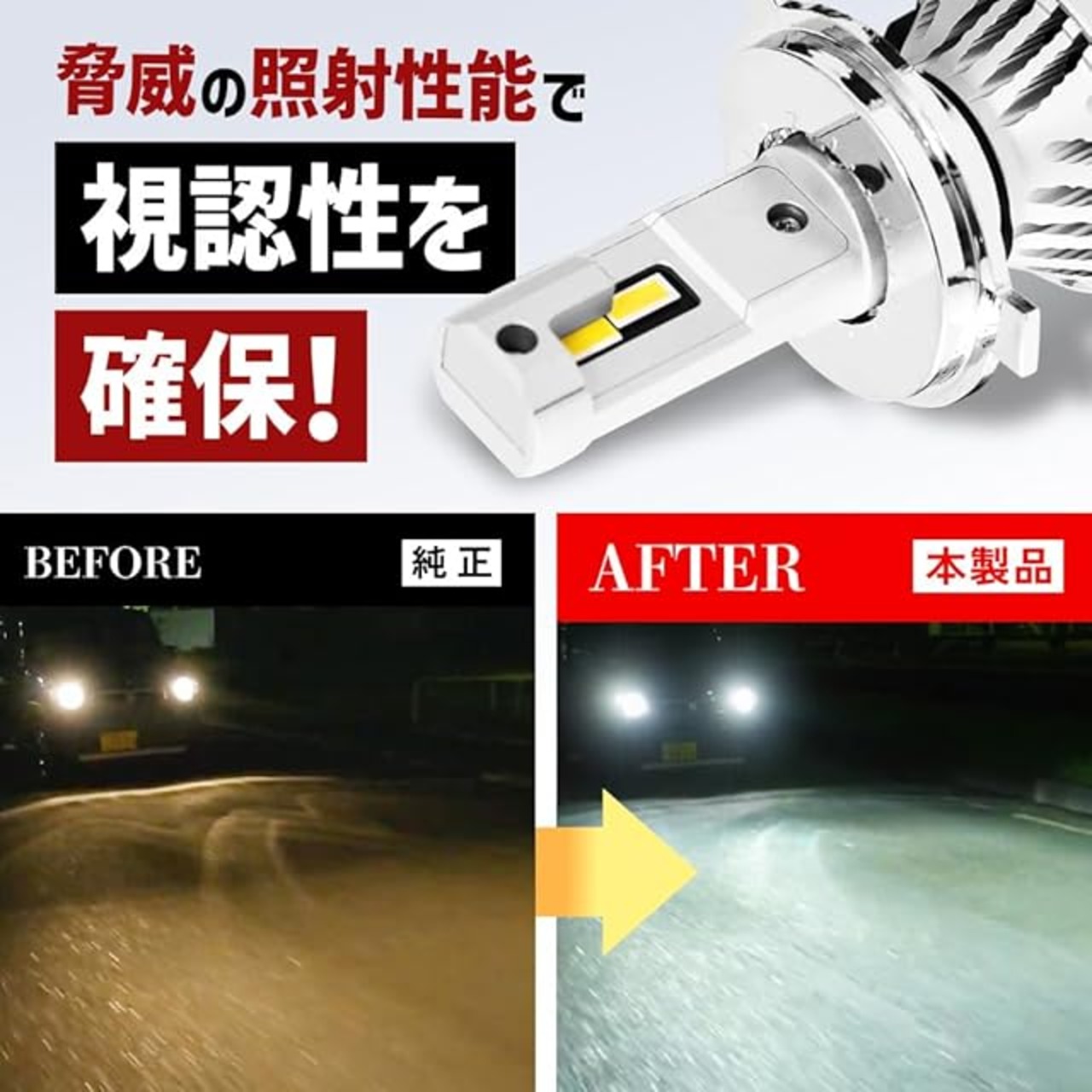 【特徴1】■60WハイパワーHID級の明るさ!単純な明るさだけを求めるのであればHIDでしたがこちらのLEDは違います。大幅にパワーアップした光度で更に白く更に明るくなりました。この明るさはここでしか手に入りません。点灯当時の明るい状態を維持します。■純正バルブよりもやや遠方をワイドに照射し、センター手前を重点的に照射します。ロービームでは手前が明るくハイビームで光がより遠くまで届きます。街中はもちろんのこと高速道路の走行でもとても見やすいです。