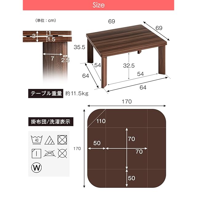 タンスのゲン こたつ 2点セット 正方形 一人用 【 こたつ本体 + コーデュロイ掛布団 】 69×69cm 木目 リバーシブル天板 省スペース 洗える スノーブラウン 68140011(70469)