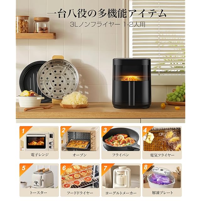 ノンフライヤー 3L 電気フライヤー ノンオイル 揚げ物 惣菜 1~2人用 可視窓 エアフライヤー LEDディスプレイ タッチパネル タイマー 温度調整 中断記憶 日本語説明書 日本語レシピ付き PSE認証済 黒色