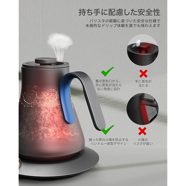 【バリスタ監修の安全・安心な使用感を備えたコーヒーケトル】 ①カップ1杯分なら約70秒で沸騰させられる1200wの安全な加熱技術を採用し、簡単に素早く湯沸かしができます。②職人によって磨き上げられた食品用ステンレスーSUS304を採用。③見やすい水位メモリ&空焚き防止機能を搭載。④ハンドル部はケトルを握った際に本体の熱でヤケドをしないよう、一体型デザインを採用。⑤蓋の蒸気口から手に蒸気が当たらない角度に設計。⑥省スペース化した難燃性素材の薄い電源ベースを採用(2つのドレインも追加で火事などの事故を防止)⑦電気ケトルの底に沸騰直後でもテーブルの上に置ける断熱構造を採用。