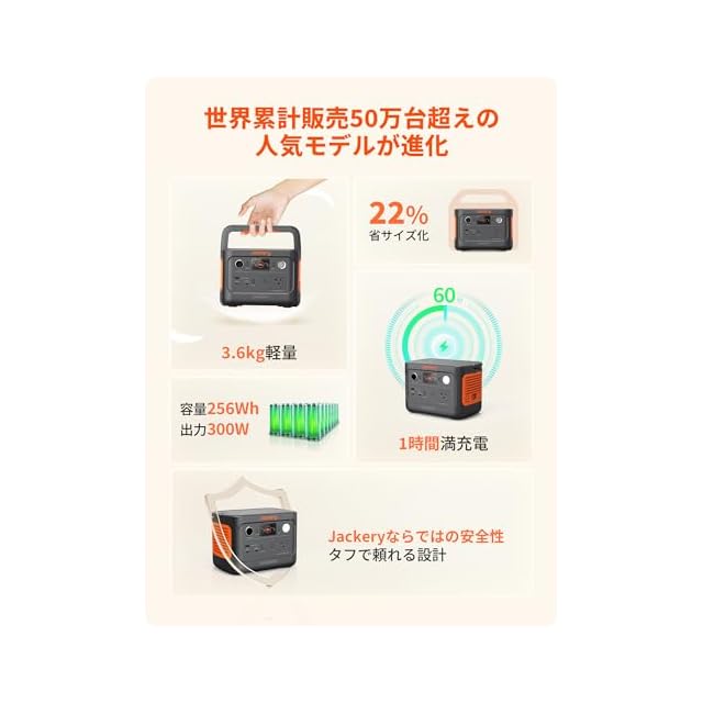 【256Whの容量に300Wの出力】従来モデルから大幅にパワーアップ。スマホやタブレットはもちろん、パソコン、ライト、小型炊飯器、小型車載冷蔵庫、扇風機、電気毛布、プロジェクターなど、ひとり暮らし防災やソロキャンプをサポート。