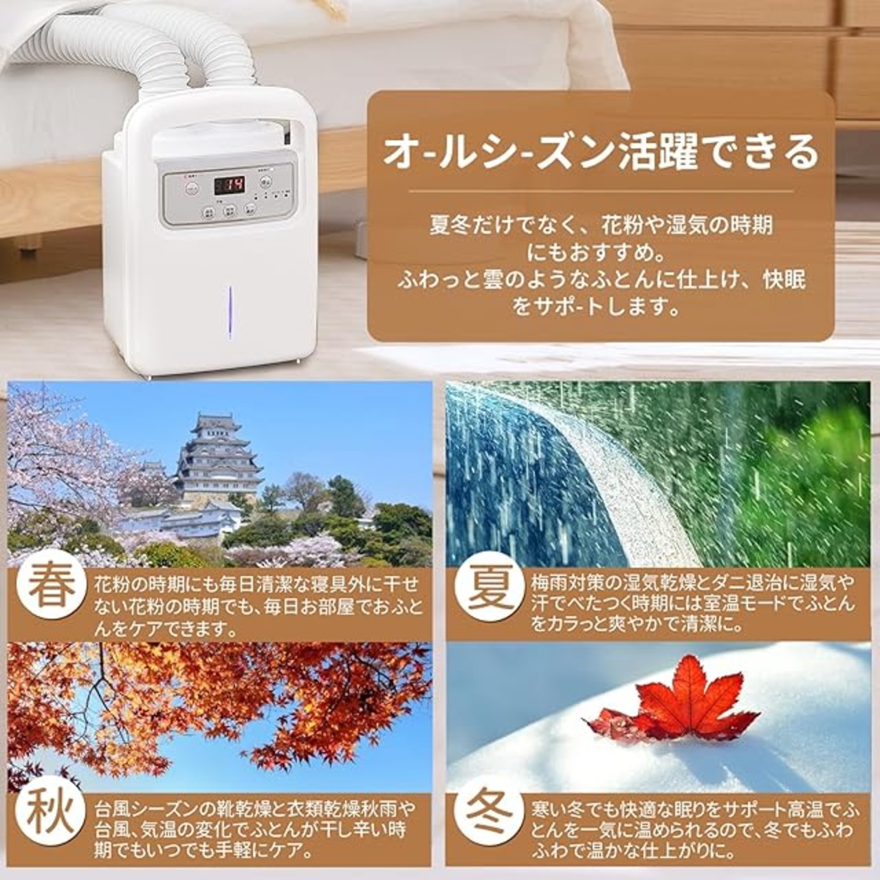 [1000Wハイパワーのツインノズル多機能布団乾燥機] オールシーズン使える布団乾燥機で、マットレスと布団の間に直接差し込むだけで、温風を送ることができます。 布団の乾燥や加熱だけでなく、春の花粉の季節、 夏の梅雨シーズン、 秋の台風シーズン、 冬の厳冬期にも適します。 衣類乾燥、靴乾燥、タンスの消臭・除湿、ダニ対策などにも使用できます。