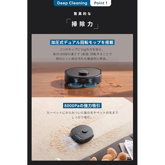 驚異的な掃除力:Anker史上最大の8000Paで、パワフルに吸引掃除します。加えて、約1kgの圧を加えて「押して拭く」加圧式デュアル回転モップにより、まるで雑巾がけをするように水拭きが可能です。