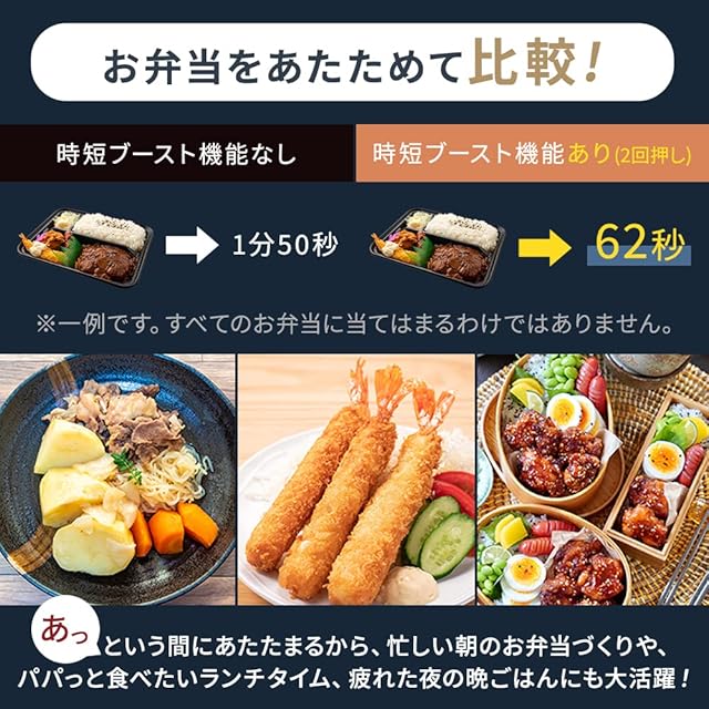 【時短ブースト機能】 あたため開始後5秒以内に「時短」ボタンを押すと、自動で出力が上がり、あたため時間を短縮することができます。 忙しい朝やランチタイムにも大活躍。 (レンジ500W・600Wの手動あたため時のみ使用できます)