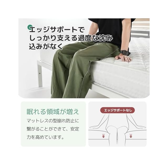 マットレスの長辺エッジ部分はコイルをしっかり強化して、型崩れ防止し、ベッドから落ちる心配もありません。高密度なポケットコイルは適度な反発力と体圧分散性により、部分的な負荷の集中を抑えます。隣のコイルに影響を与えにくく、寝返りや体動による振動を伝えにくいため、横揺れが少なく、眠りを妨げません。