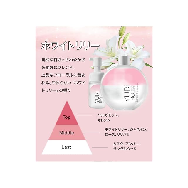 香りのプロが手がけたホワイトリリーの香り。ベルガモットやオレンジのトップノートから、ホワイトリリーやローズのミドル、ムスクやサンダルウッドのラストノートへと変化します。
