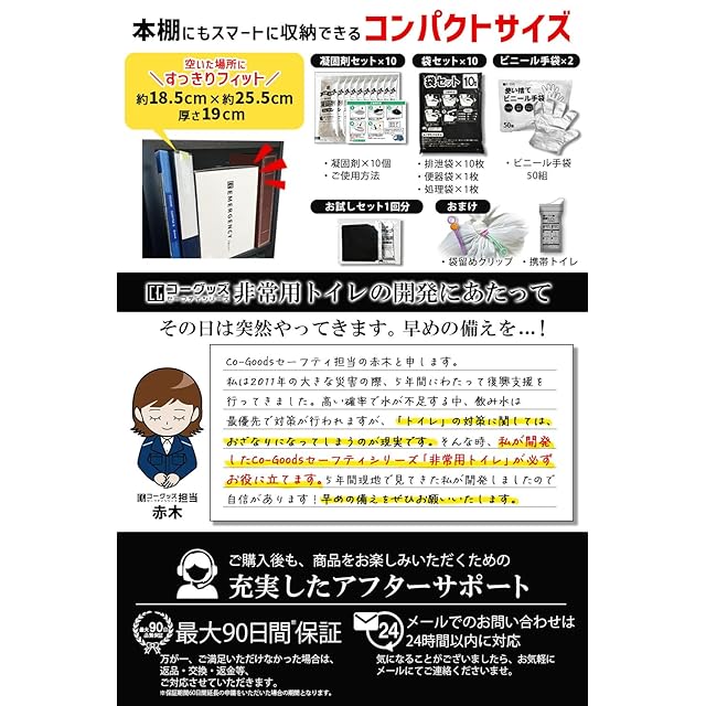 【2024年11月新登場 その日は突然やってきます 早めの備えを】 Co-Coodsスタッフの赤木と申します。私は2011年の大きな災害の際、5年間にわたって復興支援を行ってきました。災害が起きると、平穏な日々の中では想像がつきにくいかもしれませんが、高い確率で水が不足します。飲み水は最優先で対策が行われますが、「トイレ」の対策に関しては、おざなりになってしまうのが現実です。そんな時、私が開発したCo-Goodsセーフティーシリーズ「 非常用トイレ 簡易トイレ 」が必ずお役に立てます。5年間現地を見てきた私が開発しましたので自信があります!是非早めの備えをお願いいたします。