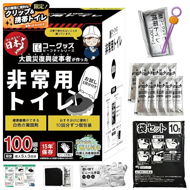 【大震災復興従事者が全力で作り上げた】 簡易トイレ 非常用トイレ 防災グッズ 災害用トイレ (+車用トイレ&袋留クリップ おまけ付き) 災害用 ポータブルトイレ 防災 トイレ 災害 車 渋滞 簡易トイレ(100回分) | primer