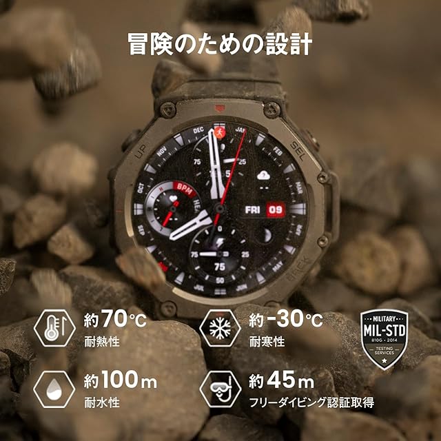 【ステンレススチールボディと卓越したディスプレイ性能】高強度なステンレススチールのベゼルと1.5インチの大画面で2,000nitを誇るディスプレイの融合は過酷な環境下でもあなたを支えます。また、暗い場所で目の疲れを軽減するナイトモードが搭載されてます。【軍用レベルの強靭さ】過酷な温度や環境に耐えるため、9項目の軍事規格の強靭性試験(MIL-STD-810G)をクリアしています。低温モードは、-30度の温度でも腕時計を使用可能で、あなたの限界への挑戦をサポートします。また、10ATMの防水性能を備え、最大45mのフリーダイビングに対応してます。