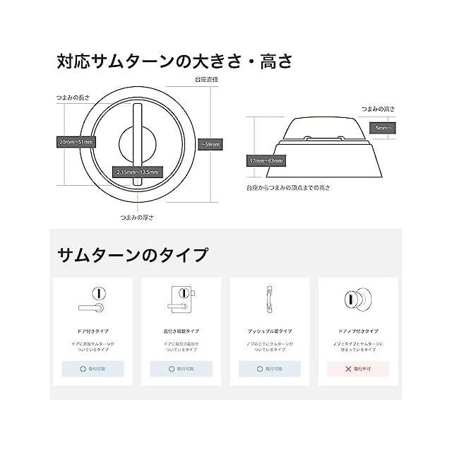 ※サムターンの形状などにより取り付けられないことがございますので、ご購入前に対応状況をご確認下さい/スマートフォンの電池切れなどに備え、お出かけの際は従来の鍵もお持ちください/ハンズフリー解錠機能は、ご利用の端末や環境などにより解錠に時間がかかったり、正確に動作しないことがあります/電池は2本同梱されています