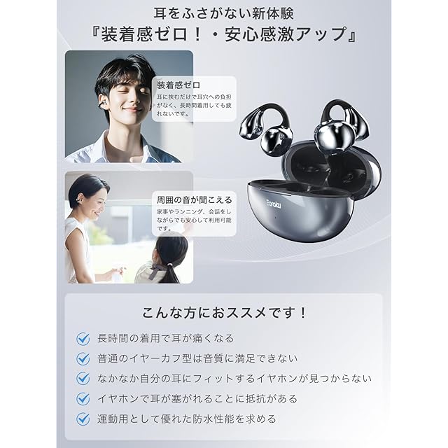 【装着感ゼロ!・動いても外れにくい】「SoundClip」OWSイヤホンはイヤカフ式にしております。C型ブリッジ部分に採用したニッケルチタン製形状記憶合金ワイヤーは、耐久性がありつつも高い弾力性を備えるため、さまざまな耳型にぴったりフィットします。また、イヤホンの重さは片耳わずか5.3gで、より軽やかでしっかりとしたフィット感を実現しました。テレワークで1日中装着していても、激しい運動時に付けっぱなしにしていても、自然なフィット感を保っております。「SoundClip」イヤホンはあなたの体の一部になることでしょう。