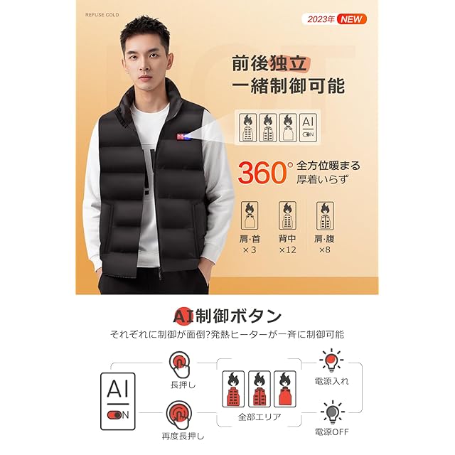 【前後23箇所発熱 前後独立&一斉制御可能】通常より発熱エリアを増やし、肩&首元に3つ、前に8つ、後に12つの内蔵ヒーターが設置され、身体を暖かく保ち、寒い日でも快適に過ごせる23箇所電熱ベストです。3つの制御スイッチを備え、前・後・肩部別々にコントロールできる上に、AI制御スイッチを加えて、全23箇所を同時に温める/オフにすることも可能になりました。電源を入れて約5秒で温まり始め、暖かさが素早く広がり、着る暖房のようにじんわりと体を温め、通勤通学やアウトドア、屋外作業など冬のお出かけも寒さをしのげてしっかり暖かい!