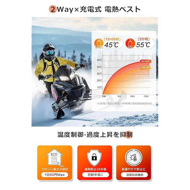 【USB/DC給電 3段階温度調節】長時間安定で持続発熱のUSB給電(普通モード)と、迅速に昇温可能なDC給電(極寒モード)の2Way給電に対応。3段階調温で、普通モード(USB口/5V)では高温(約55℃)→中温(約45℃)→低温(約35℃)で切り替え、極寒モード(DC口/7.4V)では高温(約60℃)→中温(約50℃)→低温(約40℃)で切り替えることができ、ボタンの色[赤(高温)・白(中温)・青(低温)]で一目瞭然。さまざまな寒い環境に適用、厳しい冬の寒さを撃退、寒がりの方におすすめの防寒ジャケットです。