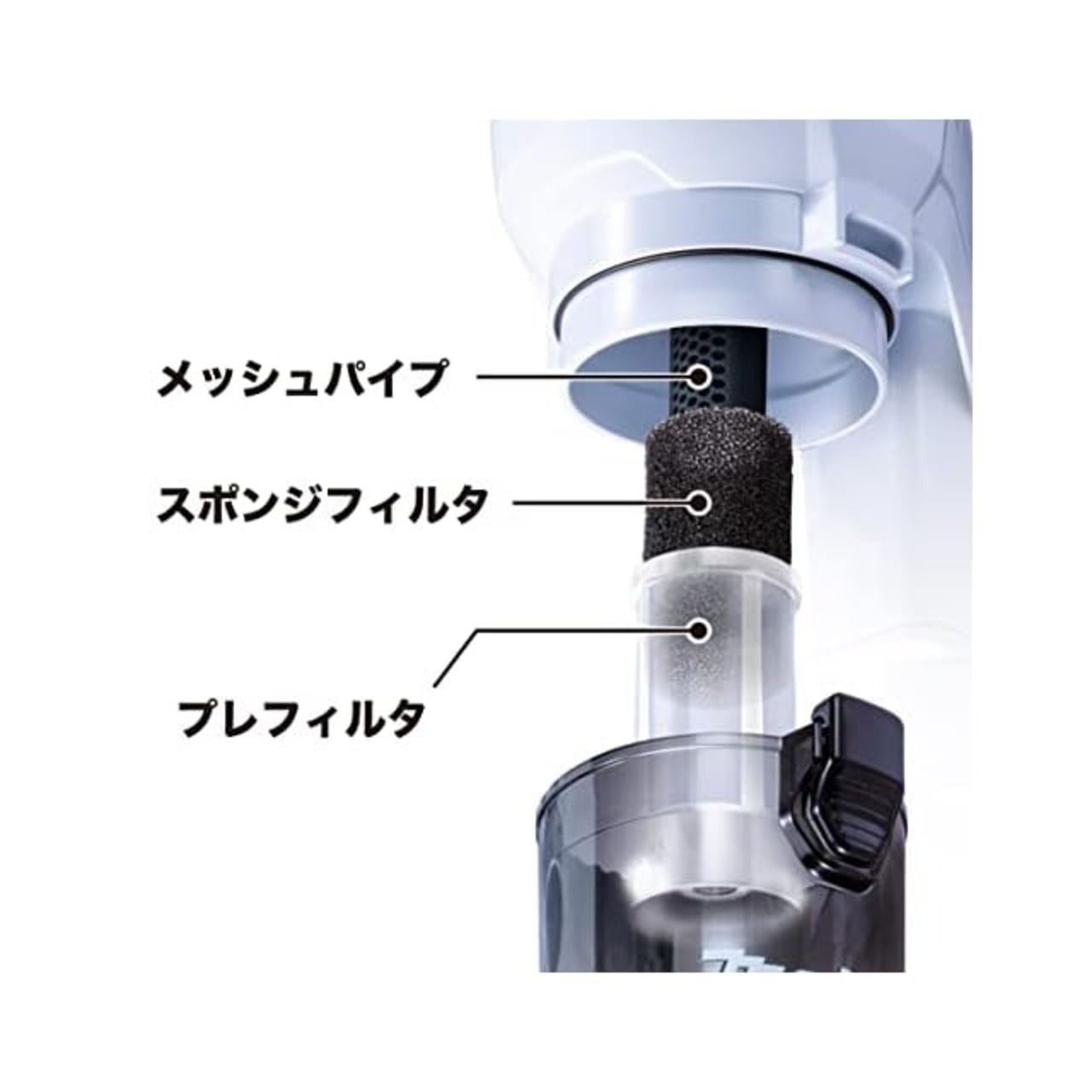 18V仕様「サイクロン一体式」新登場、静かでパワフルな吸引力。モータ制御の最適化により40Vmax仕様と同等の吸引力を実現。吸引力が長続きする「サイクロン一体式」。細かいゴミを遠心分離。サイクロンユニットを本機と一体化。新・3層構造でサイクロン部の騒音低減。プレフィルタとスポンジフィルタがメッシュパイプの風切音を低減。サイクロン未使用機と同等の静音性を実現。
