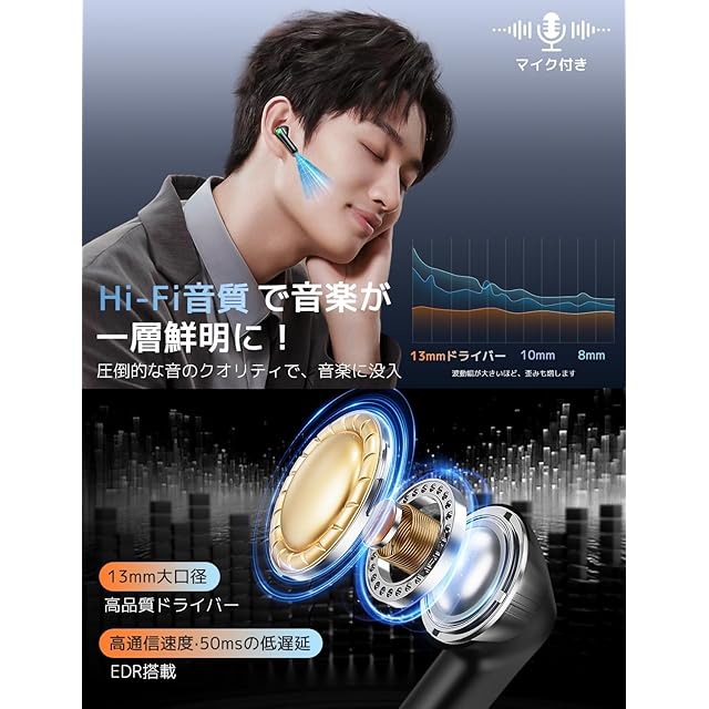 【驚くべきHiFi音質&Bluetooth 5.3】ケーブルの束縛から解放され、まるで空間が広がったかのような臨場感溢れる音楽体験を提供する次世代ワイヤレスBluetoothイヤホン登場!繊細で滑らかな音の再現に優れる革新的なAAC、SBCデコード技術と、迫力満点の重低音を得意とする高性能13mmダイナミックドライバーを組み合わせ、深みのあるリズムで高解像度の音質を忠実に再現します。この音楽ファン向けのイヤホンは、図書館、電車、または自宅で、高クオリティかつリアルなビデオをお楽しみいただけます。Bluetooth 5.3は、Bluetooth 5.0と比べて、データ転送速度が大幅に向上し、複雑な環境下での信号安定性と効率性が飛躍的に進化しました。これにより、イヤホンBluetooth接続は超低遅延で安定し、バッテリー消費も削減され、幅広いアプリケーションに対応します。また、10m以内でメモリ機能で自動ペアリング!このブルートゥース イヤホンを見逃すな!