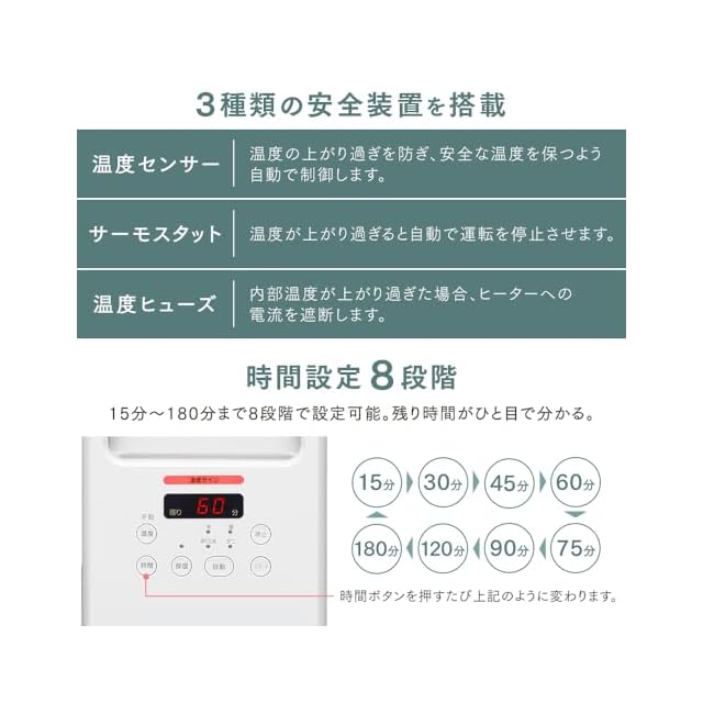 【加熱されすぎない3種の安全装置】①温度センサー:温度を測定してデータを提供する機能。②サーモスタット:設定温度より高くなりすぎると電源をカットする機能。③温度ヒューズ:発熱を感知して保護する機能