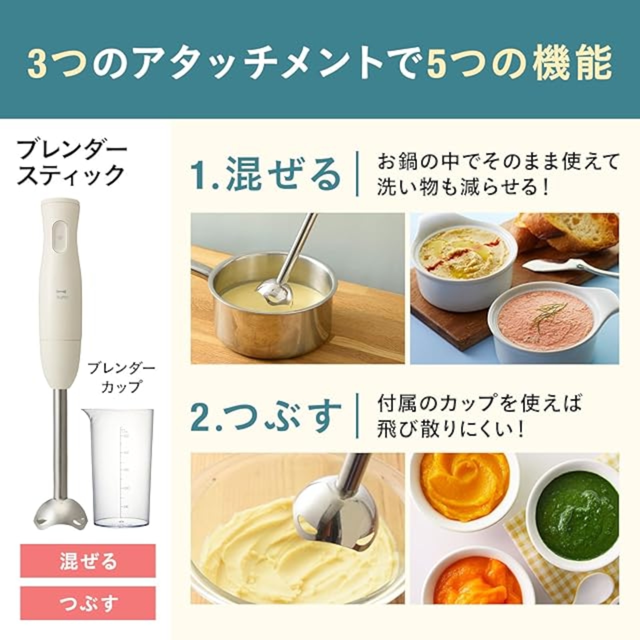 機能:ブレンダー(つぶす、混ぜる)、チョッパー(刻む、砕く)、ホイッパー(泡立てる)