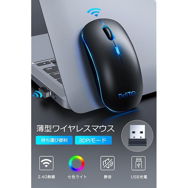 マウス 無線 静音 【薄型&高精度・高感度】 ワイヤレスマウス 3段階DPI切替 7色ライト付き 2.4GHz 節電モデル 小型 光学式 高精度 左右対称 無線 充電式 軽量 握りやすい 簡単接続 携帯便利 パソコン Windows Mac PC対応 (ブラック) | primer