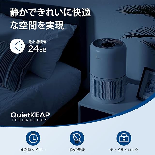 【静かで省エネ、つけっぱなしでも大丈夫! 】①特許取得済みのサイレントテクノロジーと特殊の風道設計で運転音を24dBに低減し、同時に、画面表示オフ機能も搭載されているので、光に敏感な方でもぐっすり眠れます。②静音の上におやすみモードの消費電力は14wですので、つけっぱなしにしても気になりません。