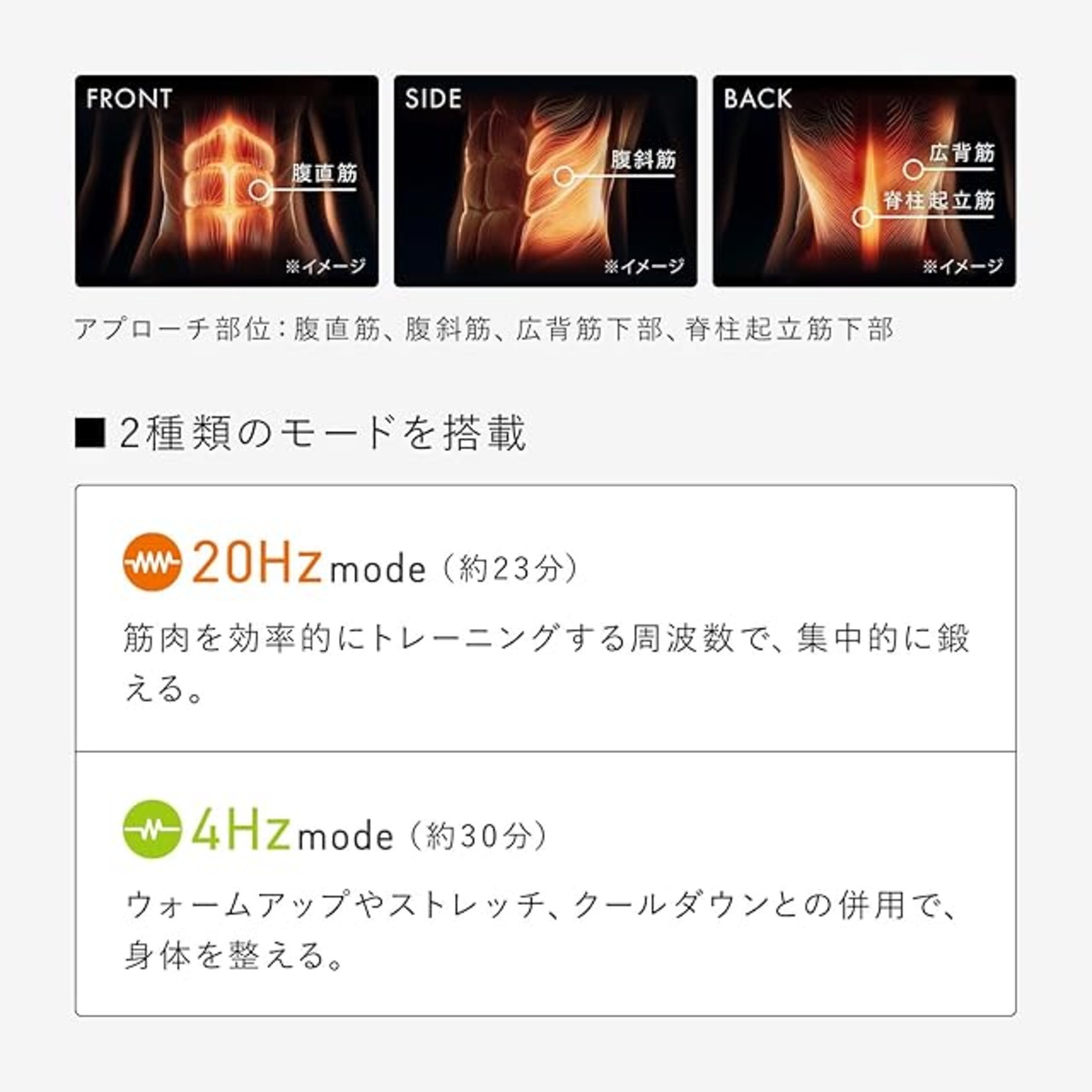 世の中に存在するEMS機器には、あらゆる周波数が設定されています。世界的な運動医科学の権威の長年の研究によると、筋肉を効率的にトレーニングできる周波数は20Hz。実証されたエビデンスを基に、SIXPADのEMSトレーニング機器には20Hzが採用されています。