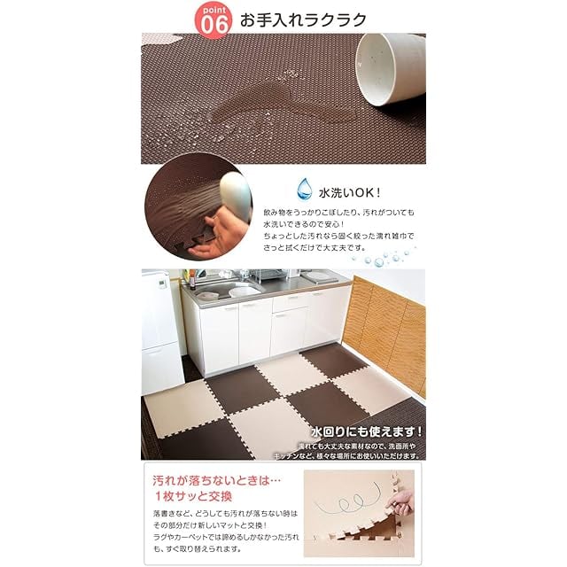 "・表面の凹凸の深さに若干の個体差がある場合がございます。 ・ロットによって色味が異なる場合がございます。 ・床暖房の種類等によって、商品に多少の反りが生じる場合がございます。 ・PE素材の特性上、使用するうちに負荷がかかる部分に多少のへたりが生じます。 そのため、既に使用しているマットに新しいマットを繋げて使用する際、上手く繋がらない場合もございますので、予めご了承ください。 2019年1月10日に素材をEVAからPEに変更しました ※床材(塩化ビニル・フローリング等)によって、色移りや変色が起こる場合がございます。床とマットの間に敷物や防護シートを敷いていただくことを推奨しております。"
