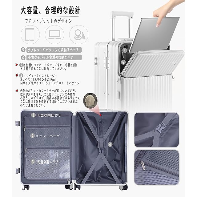 [Ashard] スーツケース 多機能フロントオープン キャリーケース ストッパー付き 機内持ち込み キャリーバッグ 携帯スタンド USBポート付き カップホルダー付き 隠しフック機能 超軽量 耐衝撃 静音 360度回転 ダブルキャスター アルミフレーム ピュアPC材質 大容量 TSAロック搭載 旅行 ビジネス 出張 (ホワイト, Sサイズ /42L /機内持込 (1-3泊)) | primer