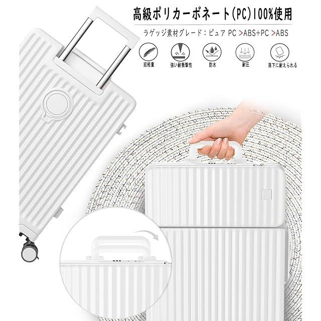 「丈夫かつ軽いPC素材、世界標準のTSAロック」 表面素材は高耐衝撃性を持つPC(ポリカーボネート)を100%使用。高弾性で、変形しにくい。ABS素材を採用した市販品より頑丈で耐久性に優れ、ABS+PCスーツケースより軽量で持ち運びやすい。PC 素材は、現在市場で最も一般的に使用され人気のあるハードシェル ラゲッジであり、防水性、耐摩耗性、スタイリッシュさ、耐衝撃性、落下耐性を備えています。弊社のスーツケースには世界標準のTSAロックが装着されており、ロックしたまま荷物を預けることができ、税関を早めに通ります。 ※鍵は航空会社検査専用のため本製品には付属しておりません。