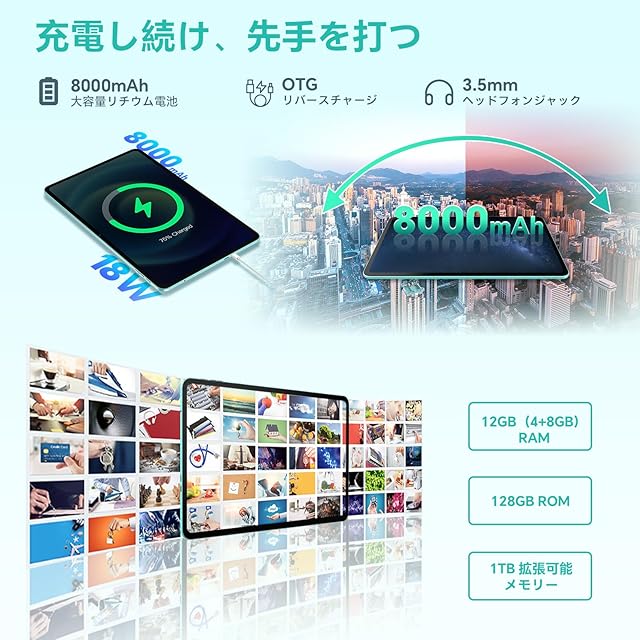 【8000mAh大容量+12GB+128GB+1TB拡張可能】ODEA A12 android タブレット 大画面 、大容量8000mAhポリマーバッテリーを搭載し、バッテリーの長寿命を誇ります。Type-Cポートを搭載し、充電がより便利になりました。ODEA Labsのテストによると、通常のタブレット使用習慣を持つユーザーであれば、バッテリーは最大8時間連続使用できる。また、12GB(4GB+8GB拡張)のRAM+128GBのROMメモリーを搭載し、最大1TBまで拡張可能。3.5mmヘッドフォンジャックと相まって、プライベートな視聴体験を楽しみ続けることができる。
