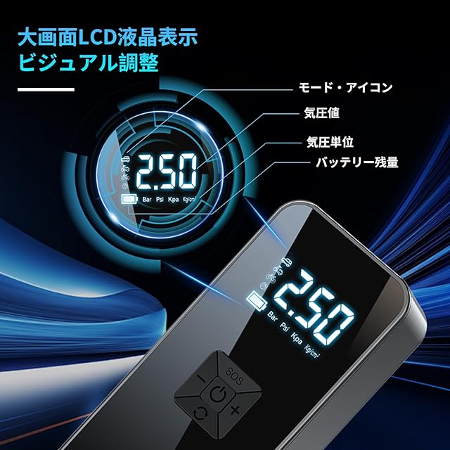 【LCDデジタル表示&4種類の気圧単位】 この 空気入れ 電動 は、大型LCDディスプレイを搭載し、バッテリー残量・現在の空気圧・設定空気圧が 一目で確認可能! 夜間や暗い場所でも数字がくっきり見えるので、いつでもどこでも安心して使用できます。 さらに、 BAR / kg/cm² / KPA / PSI の4種類の気圧単位 に対応し、ワンタッチで簡単切り替え! ✔ 車 空気入れ、自転車空気入れ、バイク 空気入れとして幅広く活躍!