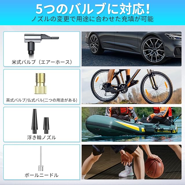 【安心の1年保証&充実の付属品】 ✅ セット内容:電動空気入れ本体、エアホース(米式バルブ)、英式/仏式バルブアダプター、ボール用ニードル、浮き輪用ノズル、USB充電ケーブル、収納袋、日本語説明書。 ✅ 1年間のメーカー保証付き! 万が一の故障や不具合にも 24時間以内に対応!