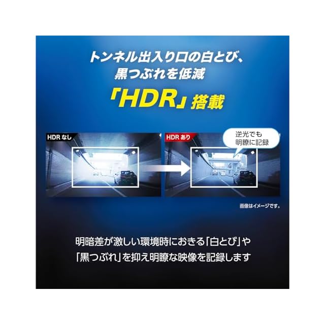 トンネル出入り口の白飛び、黒つぶれを提言、前後2カメラに「HDR」を搭載し、また、画像チューニングを行ったことで明瞭に録画。