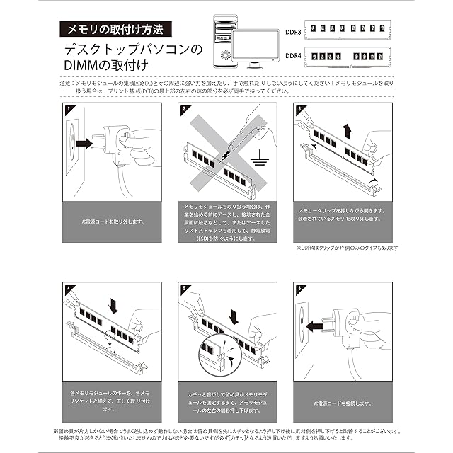 概要と注意点:DDR4 デスクトップ用 3200Mhz JEDEC準拠。デスクトップPCメモリ。JEDEC準拠品。標準で3200Mhzのメモリです。CPUなどの環境により2933MhzのPC環境ならばに下位互換も致します。メモリには下位互換機能はございますがご利用予定のPCのメモリクロックが2666Mhz以下特に2400や2133Mhz世代のPCではこちらのメモリはマザーボードが対応していない(OC対応の場合を含む)ことが多いためあらかじめマザーボードの動作クロックをよくご確認上ご購入ください。マザーボードのbiosを更新することで問題が改善することはございますが対応チップセット以外での動作保証は致しかねますのでご了承ください。非対応機器や他メモリと混在させる場合は認識しない症状や片方が認識しないなどの症状が発生しますのでご注意ください。またマザーボードにはメモリを設置する優先順位がございますので必ず順番通り設置ください。うまく認識しない場合は設置が甘いこともございますので取り付けも併せてご確認ください。目安でメモリは手の感覚でカチッとハマらないと正常に認識しないことがございます。