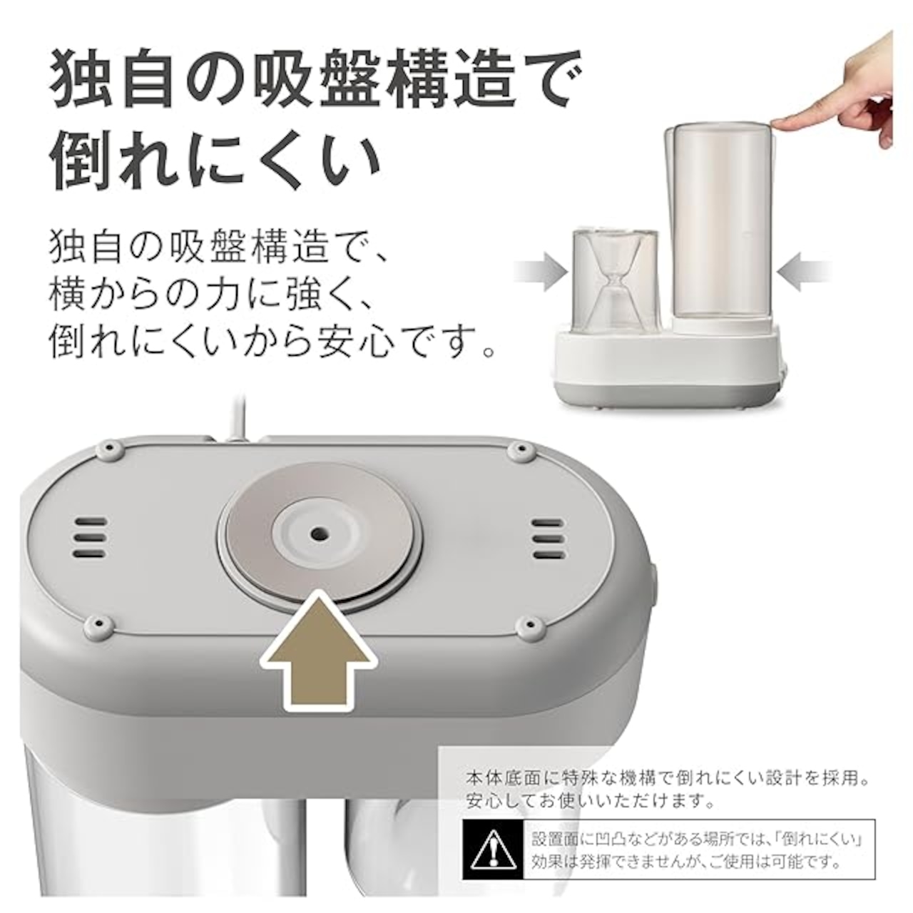 1独自の吸盤構造で倒れにくい。横からの力に強く、倒れにくいから安心です。2沸騰させたキレイな蒸気で清潔。沸騰されたキレイな蒸気でお部屋を潤します。