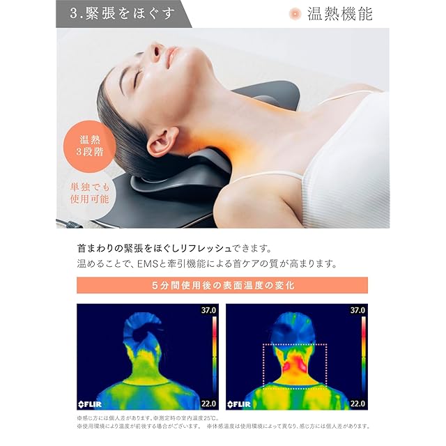【首の深部まで温めてリフレッシュ】首まわりを温めることで首の緊張をほぐします。自重でより深くまで熱が伝わるので、首を温めながらリフレッシュできます。温熱単独でも使用できます。