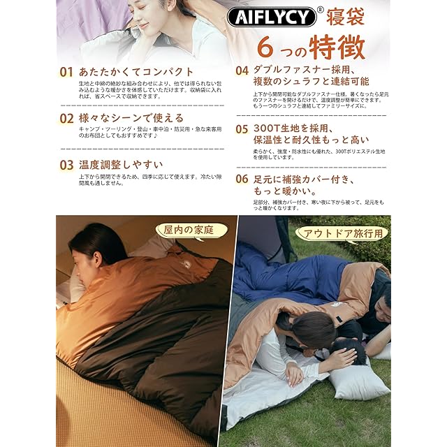 注意:本製品は2つ連絡可能な寝袋で、寝袋を複数購入する場合、連結して2人以上での宿泊が可能です。 また、寝袋のデザインも市場より広くなっており、 通常の状況下では、大人子供及び子供ふたりを同時に収容できます。二人以上の大人の場合は2個をご購入をオススメします。