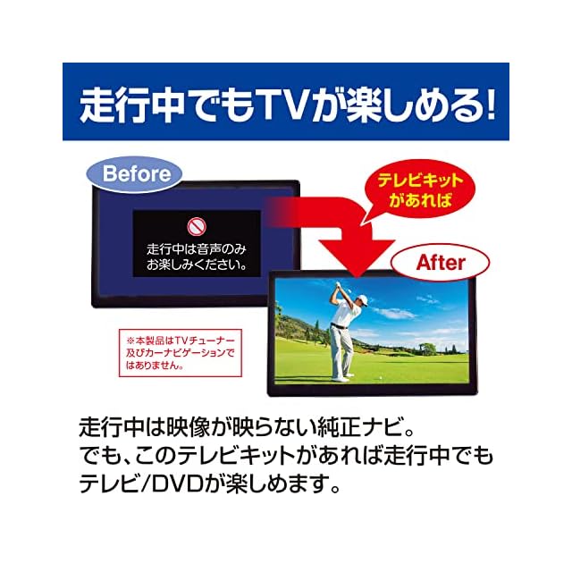 走行中は映像が映らない純正ナビ。このテレビキットシリーズがあれば、走行中でもテレビ/DVDが楽しめます。純正風スイッチで目立たずスマートに取り付け