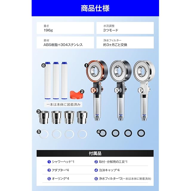 【国際汎用基準+セット内容】国際汎用基準G1/2インターフェースで、M/K/G/T4種類のジョイント付き、工具不要で自宅のシャワーヘッド規格によって簡単に取付けられます。セット内容:シャワーヘッドx1、フィルターx3(1本本体に内蔵+2本)、分解用ツールx1、M/K/G/Oアダプターx4、Oリングx4、泡沫キャップx4(アダプターの下に収納)。1年間のアフターサービス付きで、万が一製品に不具合が発生した場合は弊店にお気軽にお問い合わせください。