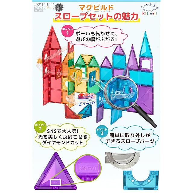 正三角形・二等辺三角形・正方形・長方形の多彩な6色のパーツに、ボールとスロープが追加!自分だけのビーズコースターを作ろう!子どもも大人も楽しく遊べる全16種類72ピースの 玉の道 磁石ブロックの決定版