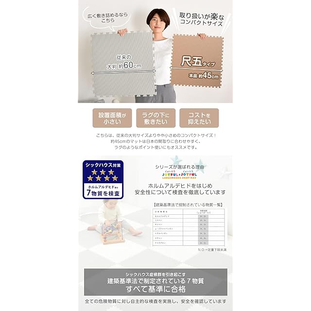 ・床暖房の種類等によって、商品に多少の反りが生じる場合がございます。 ・重量物を載せますと、マットが凹み変形する恐れがあります。 ・PE素材の特性上、使用するうちに負荷がかかる部分に多少のへたりが生じる場合がございます。 そのため、既に使用しているマットに新しいマットを繋げて使用する際、上手く繋がらない場合もございます。 ・床材(塩化ビニル・フローリング等)によって、色移りや変色が起こる場合がございます。床とマットの間に敷物や防護シートを敷いていただくことを推奨しております。 ※類似品が出回っております。本製品はシリーズ累計110万セットを突破。ホルムアルデヒドの検査や耐熱検査をし、品質にこだわった商品です。品質や販売実績は真似できません。商標登録済み ※2019年1月10日に素材をEVAからPEに変更しました。